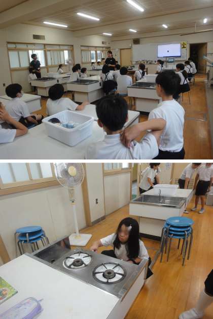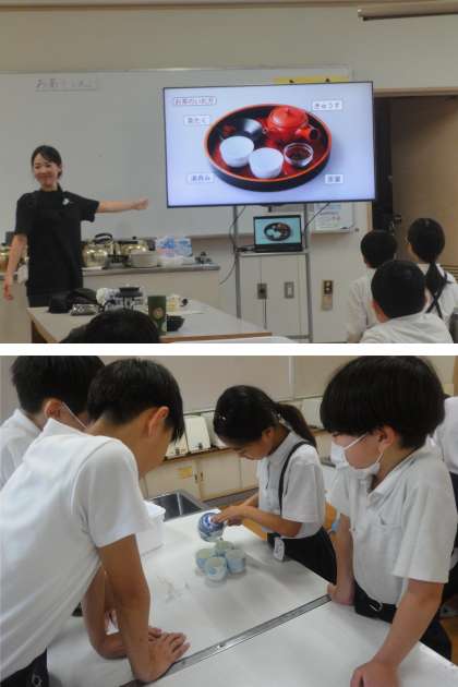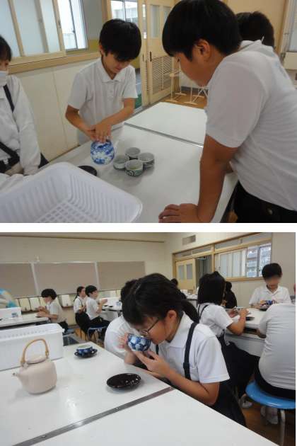 5年生の家庭科でお茶を入れる学習です。茶托・茶壺などの茶具の名前を知り、コンロで火をつける実習をしました。