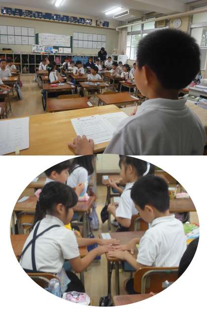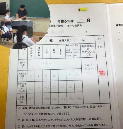 朝の会の時間に、保健委員会の児童が、担当するクラスに行って、せいけつ調べをしました。ハンカチやティッシュの他に爪の伸び具合もチェックします。