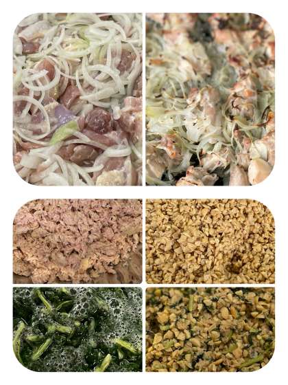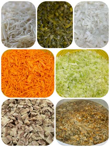 給食では、豚バラ肉を使い、海藻、野菜などを使っています。