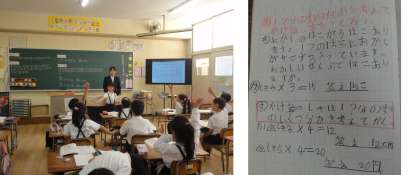 2年生の算数で、1箱に5つのお菓子が入っていて、3箱でお菓子の数はいくつなるかかけ算で求めます。また、学習の終わりには、「1つあたり〇個」を意識してオリジナル問題を各自が作る活動をしました。