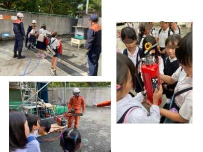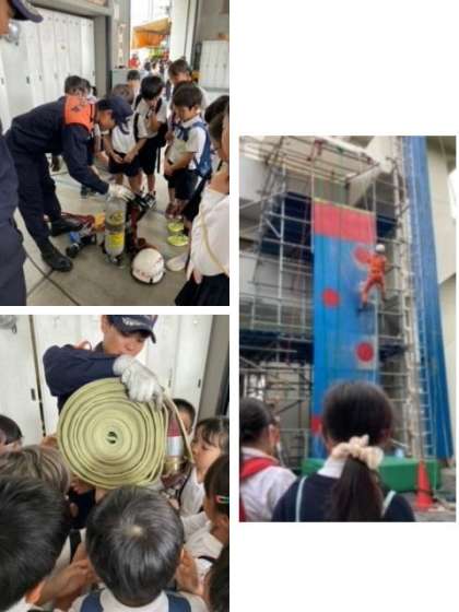 学校の近くにある都島消防署に3年生が社会見学に行きました。訓練の様子を見せていただいたり、水消火器の体験をさせていただいたり、消防車やホースなどの設備も見せていただきました。
