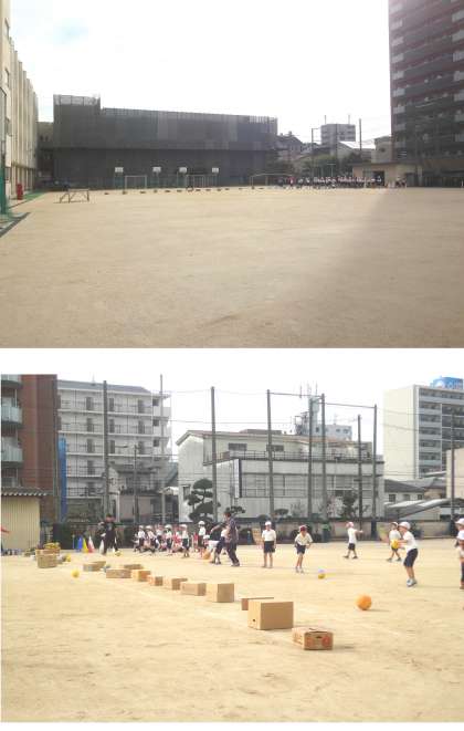 運動会での紅白チームで、1年生が「はこあてゲーム」をしました。紅白がそれぞれ横一直線に並んだ真ん中にたくさんの箱が並べてあり、ボールを投げたり、転がしたりして相手の方に箱を移動させます。相手の方に、たくさんの箱を移動させたチームが勝利です。