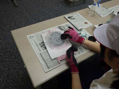 学芸員の方に難波宮遺跡について実際の柱の跡などを見学しながら、詳しい説明を聞きました。その後、2004年の大阪城の発掘調査で見つかった本物の瓦を使って、拓本を体験させていただきました。子どもたちは夢中になって取り組んでいました。