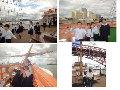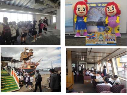 その後、客船「サンタマリア号」に乗船し、大阪港周辺を遊覧しました。USJやIKEAなどを見ながら、湊大橋の下をくぐり、船からいろいろな施設を見学しました。船内ではサンタマリア号に関するクイズにも挑戦しました。