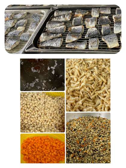 今日の給食のすまし汁と大豆の煮ものには、けずりぶし(さばぶしとにぼしを混ぜたもの)とこんぶでとっただしを使いました。