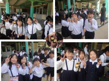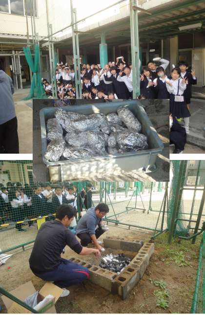 2年生が育てたサツマイモを、給食室前に作られた特設コンロでやきいもにしました。1時間目にアルミホイルにくるまれたサツマイモを、炭火の中に投入。5時間目までじっくり焼きました。