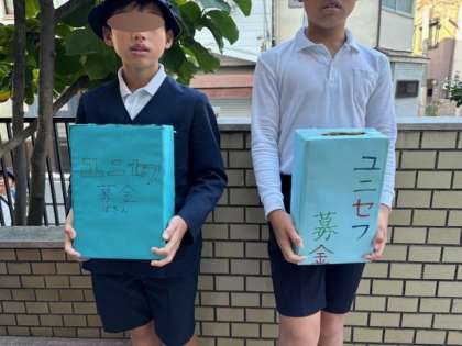 児童会では、今週中、ユニセフ募金の活動をしています。毎朝の登校時に正門前に立って、募金の呼びかけをしています。