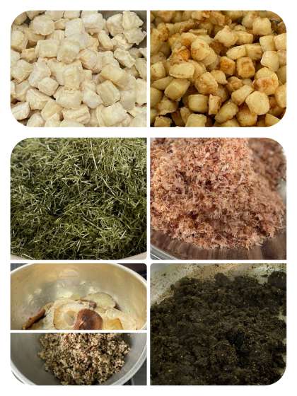 のりのつくだ煮は、もどした干ししいたけを粗みじん切りにして、かつおぶし(砕片)と、きざみのりを調味料を入れただし汁で煮つめた手作りのごはんのおともです。