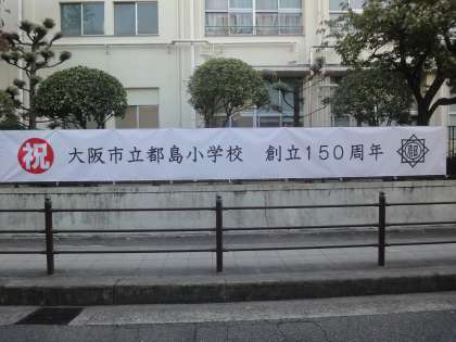 創立150周年を迎える都島小学校。来年の11月22日に予定されている記念式典に向け、横断幕が出来上がりました。正門の北側に掲出しています。
