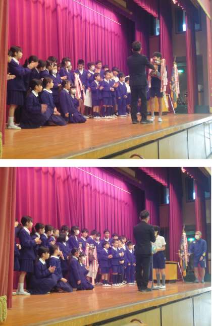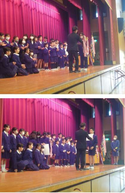 12月、新しい月の児童朝会です。朝会のはじめに昨日行われたドッジボールの大会で、本校のある連合町会の「西都島こども育成会」ドッジボールチームが、男女とも優勝し、総合優勝に輝いたことの表彰を行いました。