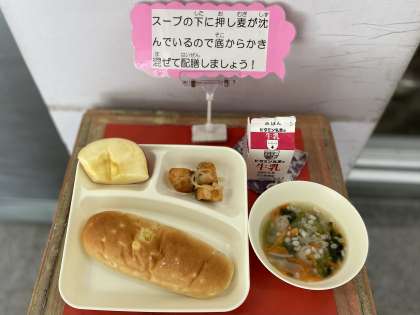 今日の給食には、さけに下味とでんぷんを付け、油で揚げてマリネ液をからませた「さけのマリネ」が登場しました。