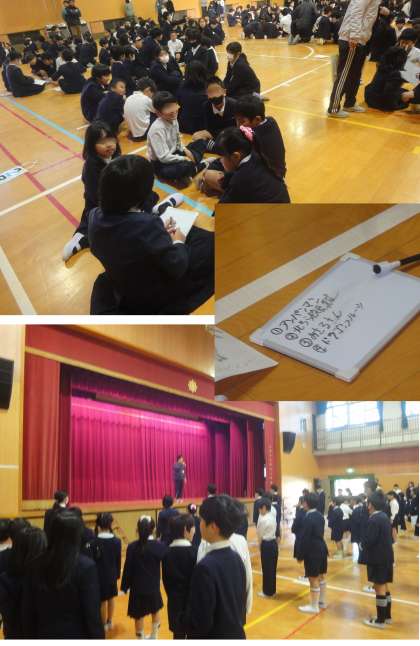 12月9日(月)の児童集会は、集会委員会による「文字探しゲーム」です。体育館のいろいろなところに画用紙に書かれた文字が出現し、それをつなぎ合わせて言葉を見つけていきます。縦割り班ごとに見つけ出した言葉をホワイトボードに書きだしていきました。