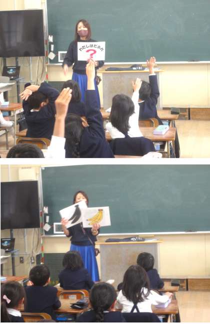 最初に「わたしは だあれ?」と問いかけ、食材の特色から、その食材名をあてるクイズをしました。「サツマイモ」や「だいず」といった名前も、しっかりと答えていました。