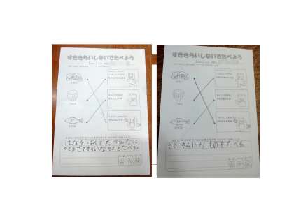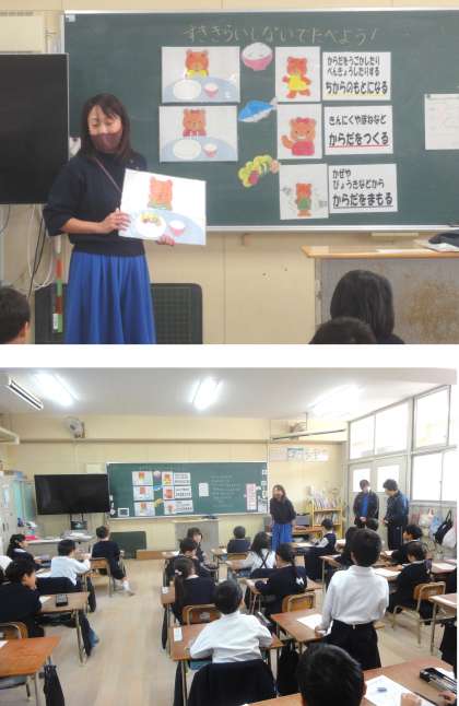 区内では、区担当の栄養教諭による栄養指導が全宇年で行われています。今日は、1年生の時間です。