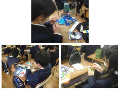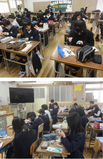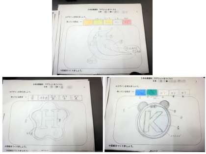 5年生の家庭科では、フェルトの布を使ったマスコットを作る活動をしていました。各自が決められた色のフェルトでマスコットをデザインし、型紙に合わせてフェルトを裁断します。前と後ろの布を縫い合わせ、中には磁石を入れます。