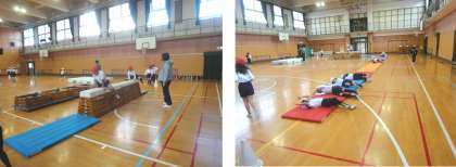 跳び箱を4つ連ねた場では、両手で体を支えて前に行く動作をして、器械運動での支持系の技の基礎を身に付けることをねらいとしています。