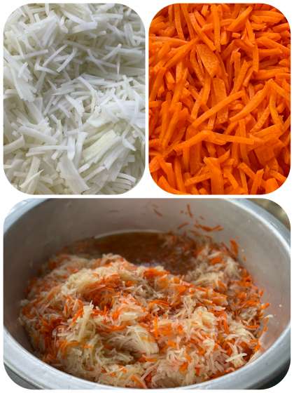 紅白なますは、だいこんの白色と、にんじんの赤色で、水引きを意味し、めでたさを表しています。平和を願う気持ちが込められたおせち料理の一つです。