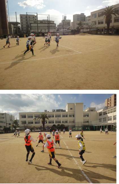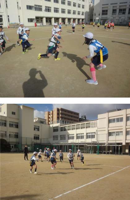 3年生が運動場でタグラグビーに取り組んでいました。タグラグビーは、タックルの代わりに、相手の腰についたタグを取ることで防御するラグビーです。