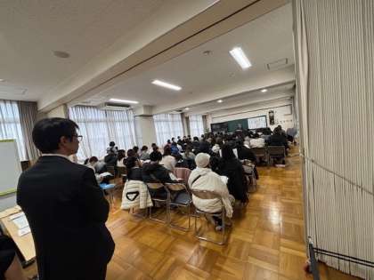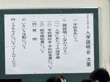 次年度、4月から入学予定の新入生の保護者説明会を多目的室で行いました。学校長のあいさつの後、準備する学用品やこれらか4月までに、子どもさんにやっておいてほしいことなど、細かな説明がなされました。