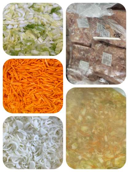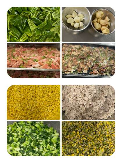 豚肉に、しょうが汁、にんにく、オイスターソース、こいくちしょうゆ、綿実油で下味をつけ、ピーマンの細切りを混ぜ合わせて、焼き物機で焼いています。