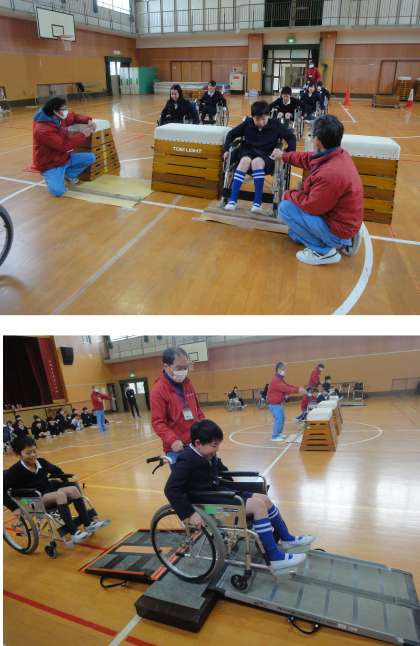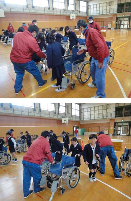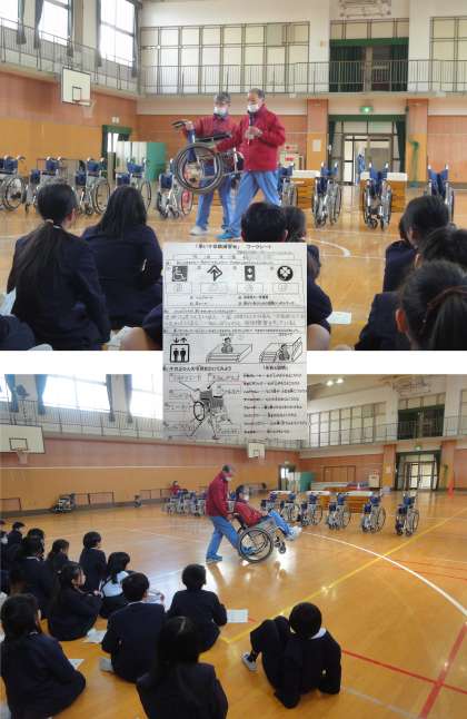 4年生では、大阪市立心身障がい者リハビリセンターの方々に来ていただき車いすについての学習と、車いすに乗る・車いすを押す体験をさせていただきました。