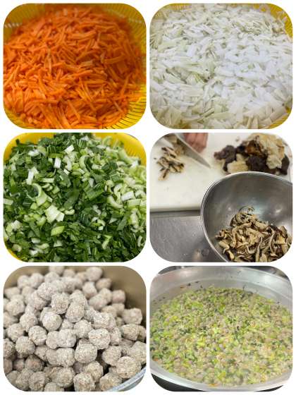 給食の中華がゆは、米のほかに肉だんご、チンゲンサイ、だいこん、にんじん、しいたけが入っています。