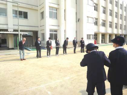 学校長の話、生活指導の先生の話のあと、今日現在わかっている、今年度末で都島小学校を去って行かれる教職員からの子どもたちへの離任のあいさつがありました。