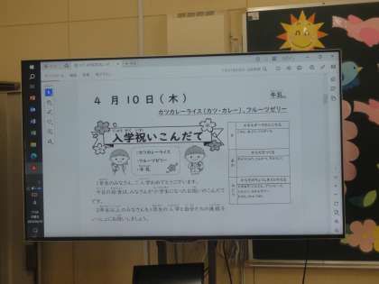今日の給食は「入学お祝いこんだて」で、子どもたちの好きなメニューが目白押し。詳しい献立は、別の記事にてお確かめください。