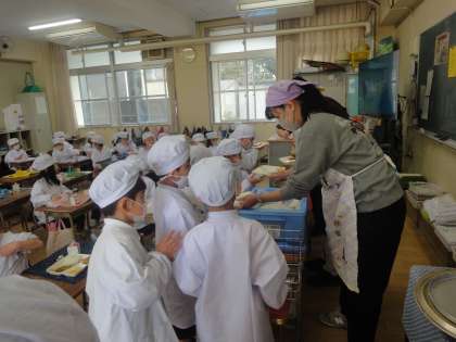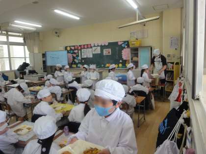 配膳時は、自分のお皿を持って決められた通路に並び、配膳してもらったら、決められた順路で自分の席に戻ります。そのうち、給食当番が、自分たちでもおかずやご飯の配膳をするようになっていきます。