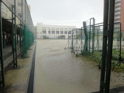 1年生が下校の準備をしていた13時過ぎから急に空が暗くなり、冷たい風が吹いてきたかなと思うと、急な大雨と雷がありました。
