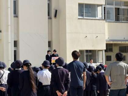 晴天の下、新しい週のはじまりに、児童朝会がありました。学校長からは、5月に本校で、校外学習として行く大阪関西万博についての話がありました。