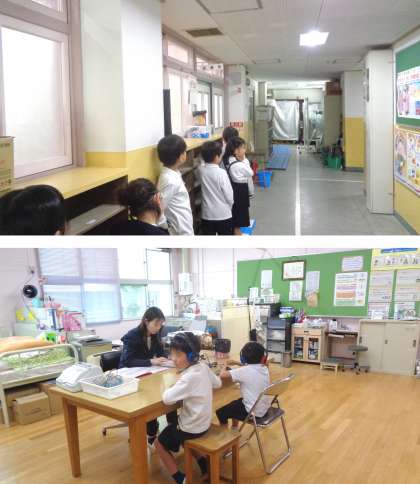 保健行事が続く中、連休明けの今日は、1年生の聴力検査です。検査は、静かな所で行うため、保健室に入るのは検査を受ける2名ずつ。廊下で待つ人数も最低限で、検査が終わった子が、教室に帰り、次に廊下前で待機する子を呼びにいきます。
