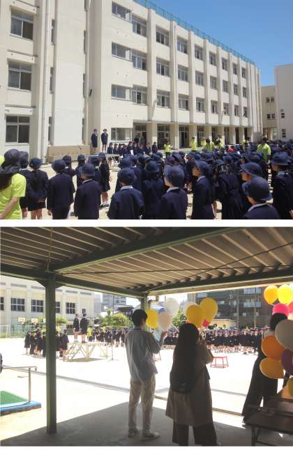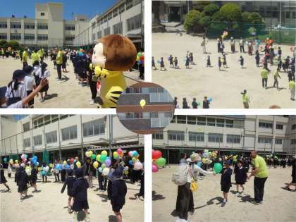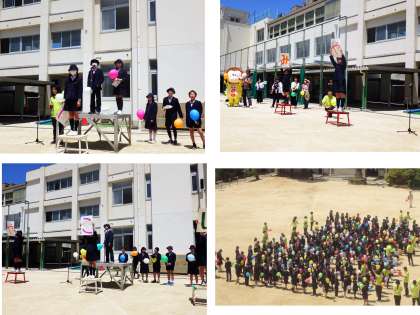 リリース前にセレモニー集会として児童会の進行で、150周年の歌を歌い「みやこじま」の文字を頭にした「みやこじまのことば」を言って、バルーンのリリースしました。