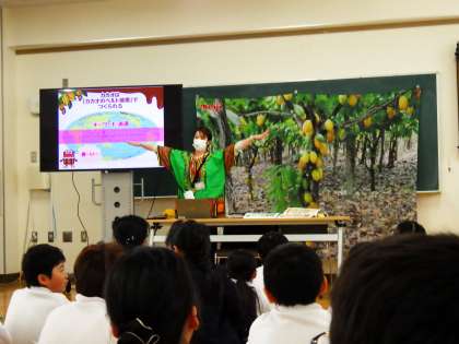 民族衣装ダシキを身に着けた講師の方からは、カカオが育つ国の気候や、現地の農家の仕事やカカオ生産にかかわる課題などについて、写真や動画を使ってわかりやすく教えていただきました。子どもたちは身近なお菓子であるチョコレートが、たくさんの人や自然の恵みでできていることに驚きながら、熱心に話を聞いていました。