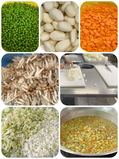 今日の給食の変わりピザは、ぎょうざの皮に新食品の「乳なしチーズ」とツナ、コーン、ピーマン、ピザソースを混ぜ合わせた具をのせ、焼き物機で焼いています。