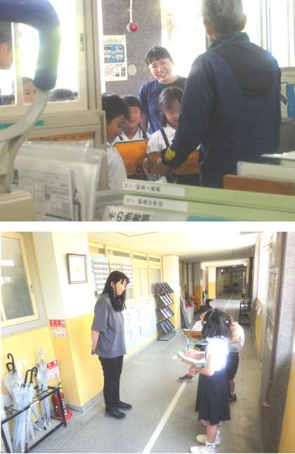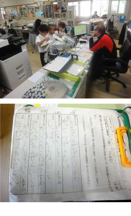 この日は、校長先生・教頭先生・教務主任の先生・給食担当の先生に職員室周辺でインタビューしていました。