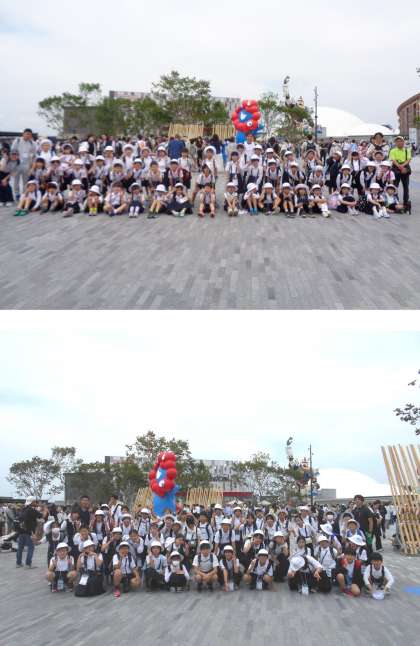 「PASONA NATUREVERSE」の見学の後、ちょうどガンダムとミャクミャクが背景に来る場所で学年ごとに集合写真を撮りました。