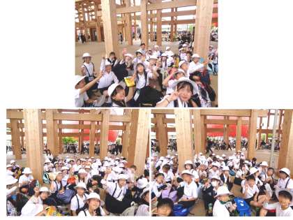 パビリオン見学の後は、大屋根の下でおやつ休憩を取りました。この日は都島中学校の1年生も来ていて、途中何度か出会うことができました。