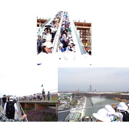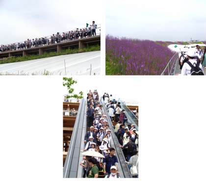 最後に大屋根リングの上に上がり、景色を楽しみました。ちょうど、噴水ショーが始まりリングの上から見ることができました。リングの外には海が見え、横の花壇にはラベンダーなどのたくさんの花が咲きほこっていました。