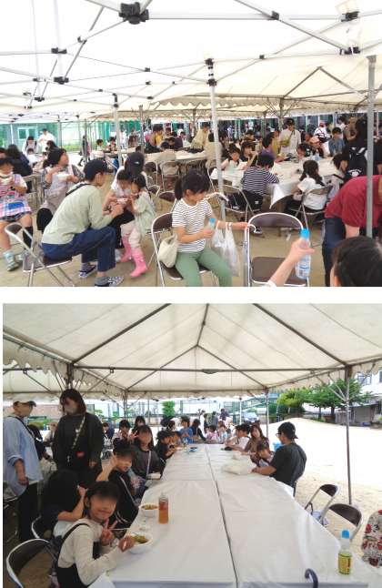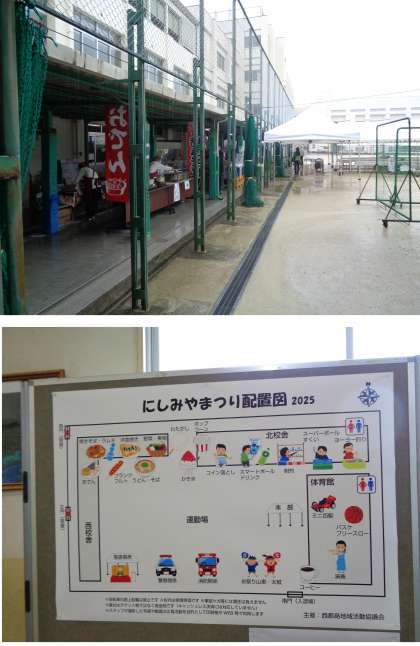 5月17日(土)に、地域のお祭である「にしみやまつり」が、都島小学校で行われました。朝からの大雨で、準備される地域・PTAの方々は大変でしたが、開場予定の11時には雨がやみ、下はぬかるんでいましたが、運動場でも活動ができるようになりました。