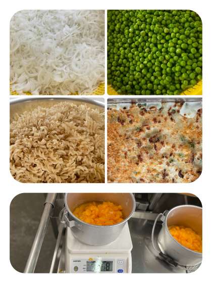 今日のマカロニグラタンは、鶏肉とたまねぎを炒めたものにクリーム、小麦粉、グリンピース、マカロニを加え、チーズとパン粉をふって焼いています。