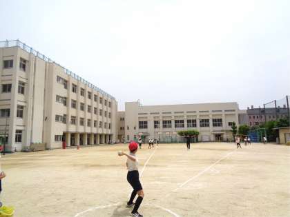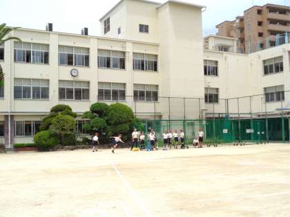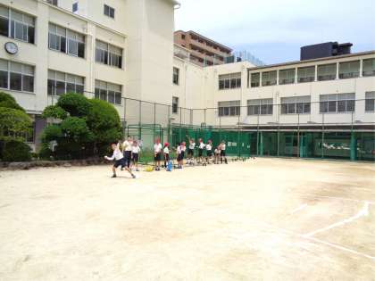 この時間は、5年生が測定をしていました。都島小の子どもたちは、こども会でボールを使って運動をしている子が多く、特に女子の記録がいい傾向にあります。