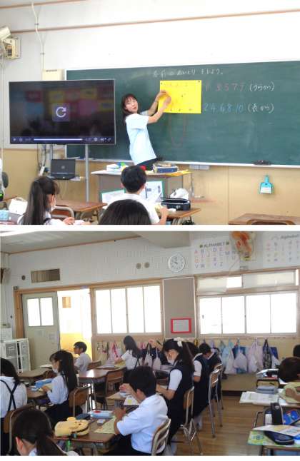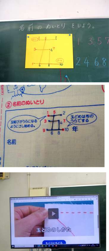 5年生が家庭科で、文字を縫いとる学習をしていました。この日は、五年生の「五」を糸と針で縫いとっていきます。