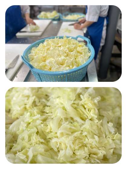 今日の給食のキャベツのピクルスは、キャベツを焼き物機で蒸して、砂糖、塩、ワインビネガー、薄口しょうゆで作った調味液とあえています。