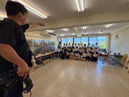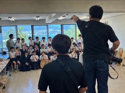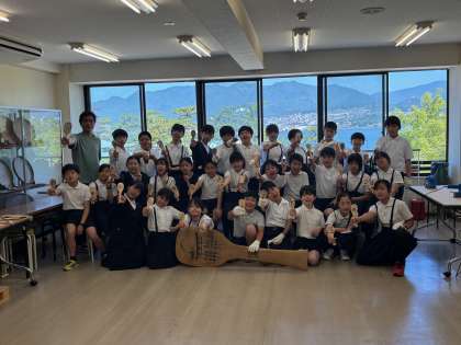 しゃもじ作りが終わって2組は、宮島の大きなしゃもじといっしょに写真を撮りました。