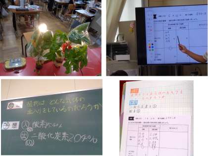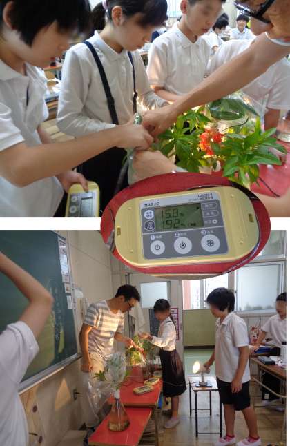 ビニール袋をかぶせたホウセンカに呼気(二酸化炭素)を入れて、ビニール袋内の酸素と二酸化炭素の濃度をデジタル気体測定器で測り記録します。1時間後に2つの気体濃度にどのような変化があるのを見ていきます。