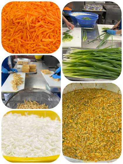 和風カレー丼は、綿実油でしょうがを香り良く炒め、豚肉、カレー粉、にんじん、たまねぎの順に入れて炒め、けずりぶしでとっただし、うすあげを加えて煮、塩・カレールウの素・こいくちしょうゆで味付けし、最後に青ねぎを加えた丼です。