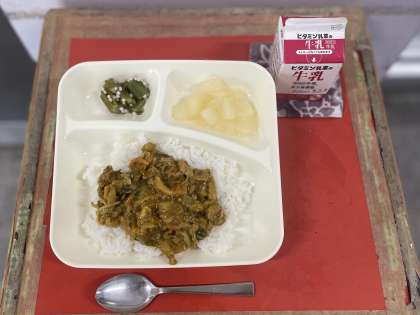 だしの風味をきかせた和風のカレーをご飯にかけて食べる、子どもに好評な献立です。