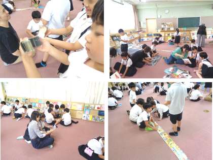 1年生の時間では、子どもたちが図書室に入るところから、加藤先生が絵本をもって言葉をかけながら誘導し、「集まりなさい。座りなさい」といった指示が何一つなくても、自然に加藤先生の持つ絵本中心に車座になっていました。
