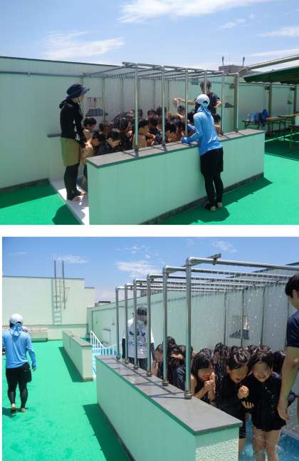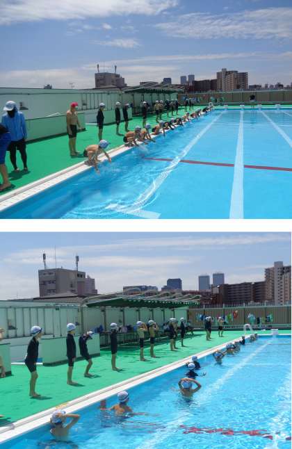 6月17日、今日はプール開きの日です。2時間目に先頭を切って4年生がプール水泳を始め、3時間目は2年生の時間です。